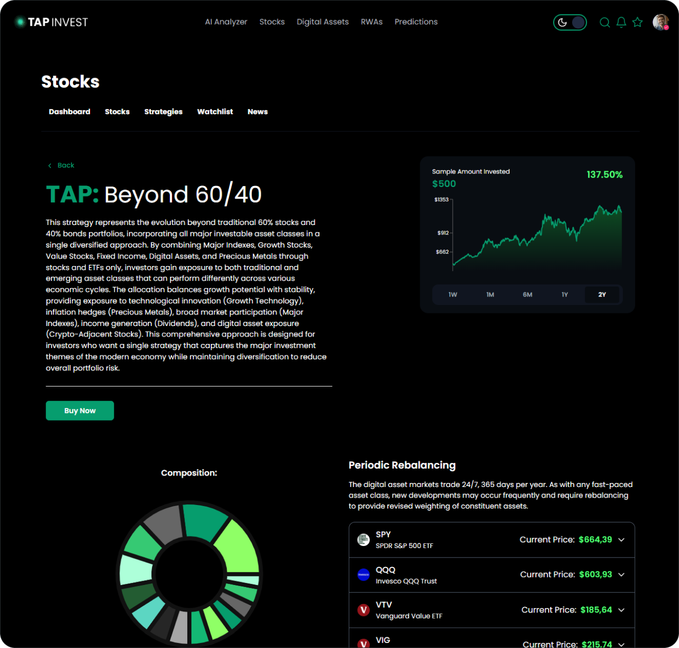 Our AI Portfolio Analyzer helps investors understand their personal financial situation and risk profile, while TAP Strategies enable data-driven portfolio decisions through subscription-based access across multiple asset classes.