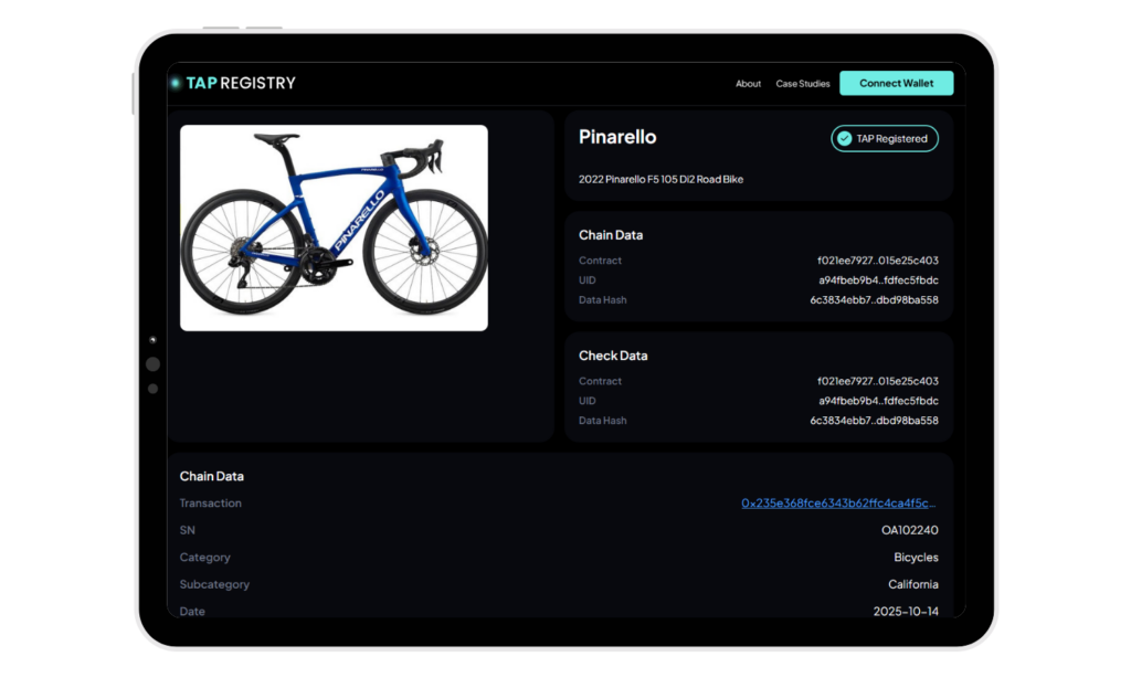 TAP Registry creates blockchain certificates on the Base network, Coinbase’s Ethereum Layer two blockchain, which offers fast and affordable transactions backed by Ethereum security. Each registered bike receives a unique identifier via QR code or NFC tag that links the physical bike to its digital record. The blockchain certificate is designed to persist over time and provide a consistent reference point for verification.
