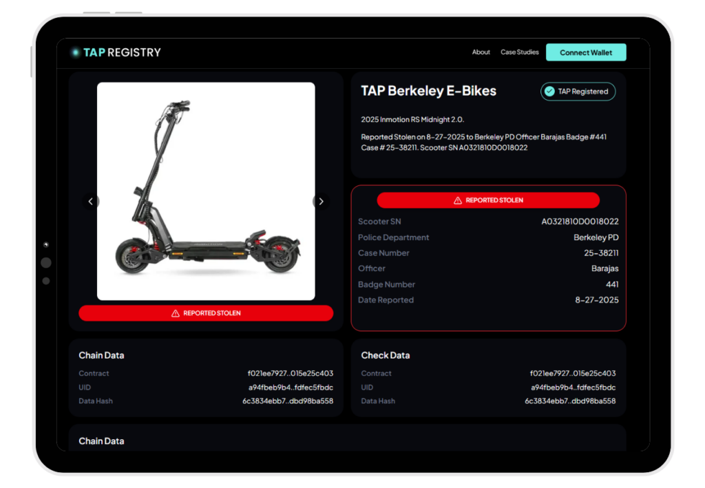TAP Registry creates persistent blockchain records on the Base network that improve transparency and verification. Buyers scanning a registered bike can see registration status and whether it has been reported stolen, along with police case information when applicable.