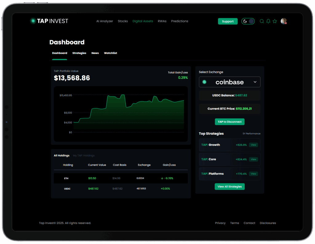 Connect to TAP Invest: Link existing brokerages and exchanges to TAP Invest for unified portfolio visibility. Explore investment strategies and execute with one tap across connected accounts.