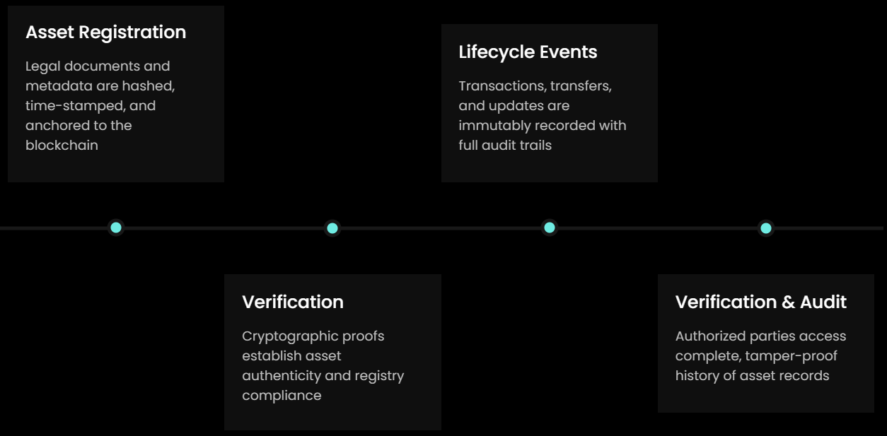 TAP Registry serves as the foundational, blockchain-anchored system of record for real-world assets, obligations, certificates, and lifecycle events. It establishes cryptographic proof of asset existence, verification status, and unaltered history through immutable on-chain audit trails.